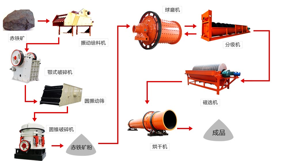首先磁鐵礦由振動給料機均勻的送到顎式破碎機進(jìn)行初破,初破后的磁鐵由皮帶輸送機進(jìn)行二破,二破后的磁鐵由圓振篩進(jìn)行篩選,不合格返回圓錐破碎機繼續(xù)破碎,合格的被送到球磨機進(jìn)行研磨,研磨后的磁鐵礦粉磨被送到分級機進(jìn)行分選,不合格的被返回繼續(xù)研磨,合格的被送到磁選機進(jìn)行磁選,磁選后的物料經(jīng)脫水干燥后近視我們所要的產(chǎn)品。